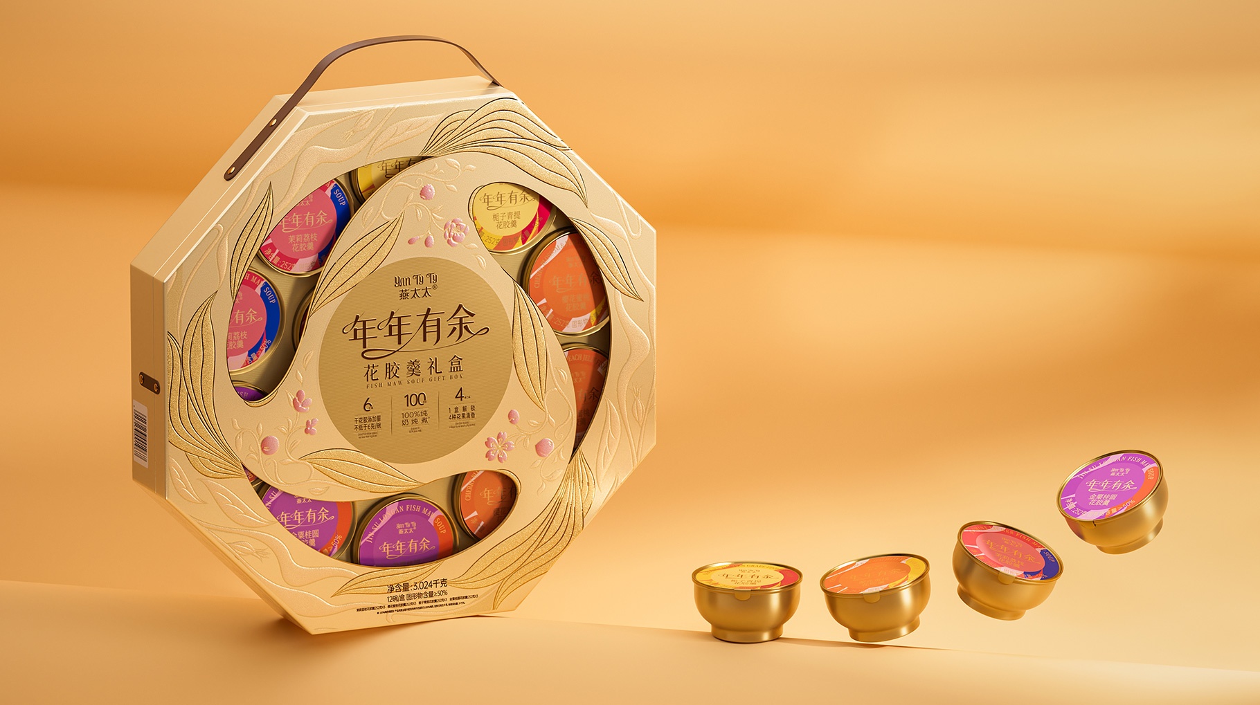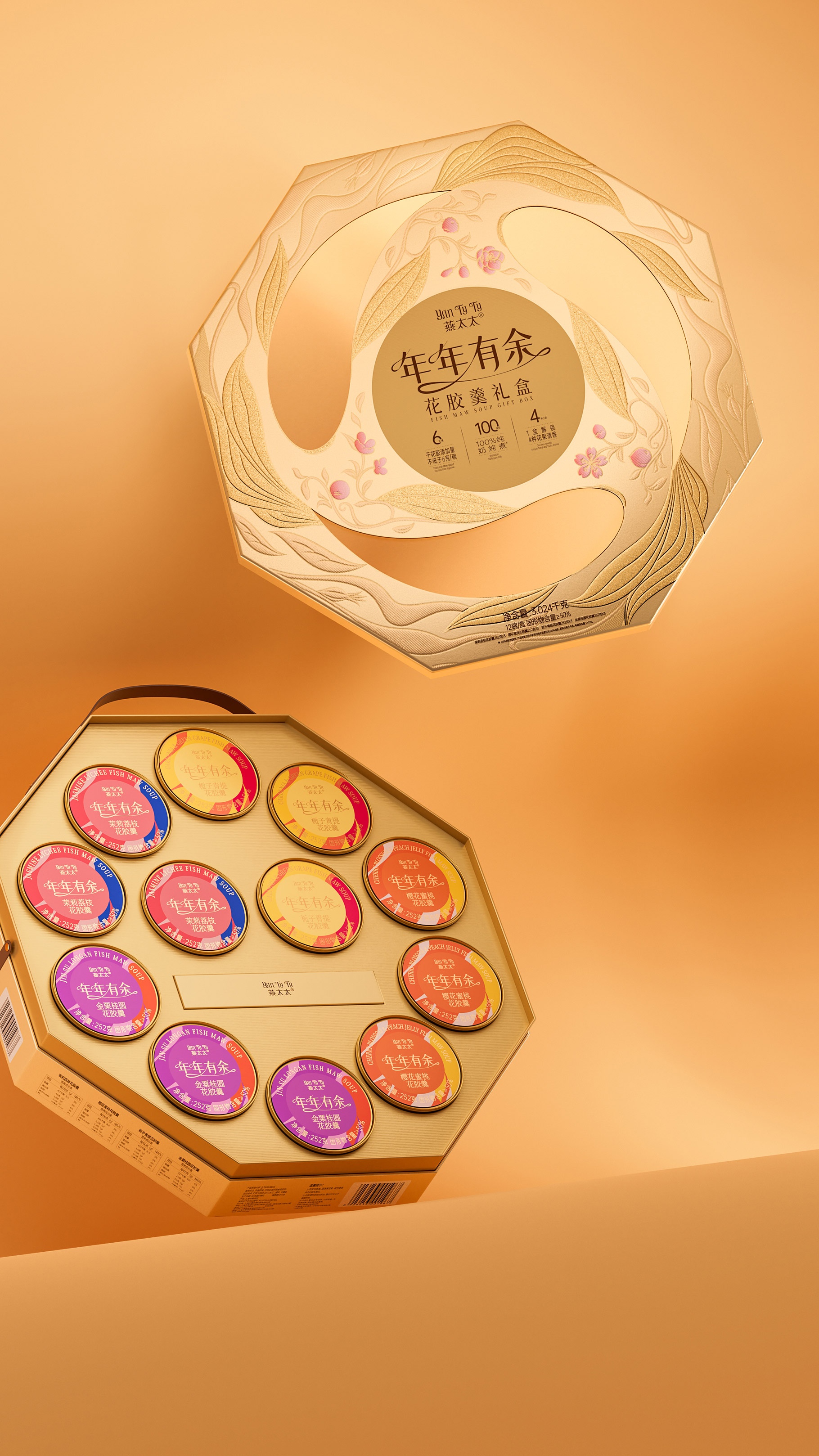 燕太太為山姆會員店精心專供的新年花膠羹禮盒產(chǎn)品,團(tuán)隊在思考新年禮盒產(chǎn)品的時候,旨在通過一款獨特而富有深意的包裝設(shè)計,傳達(dá)出對美好未來的期許與祝福。此設(shè)計以“年年有余”為主題,巧妙融合魚與不同口味主題花卉的元素,通過完美旋轉(zhuǎn)的圖案創(chuàng)意,打造出一款既體現(xiàn)傳統(tǒng)韻味又不失現(xiàn)代美感的新年花膠羹禮盒。