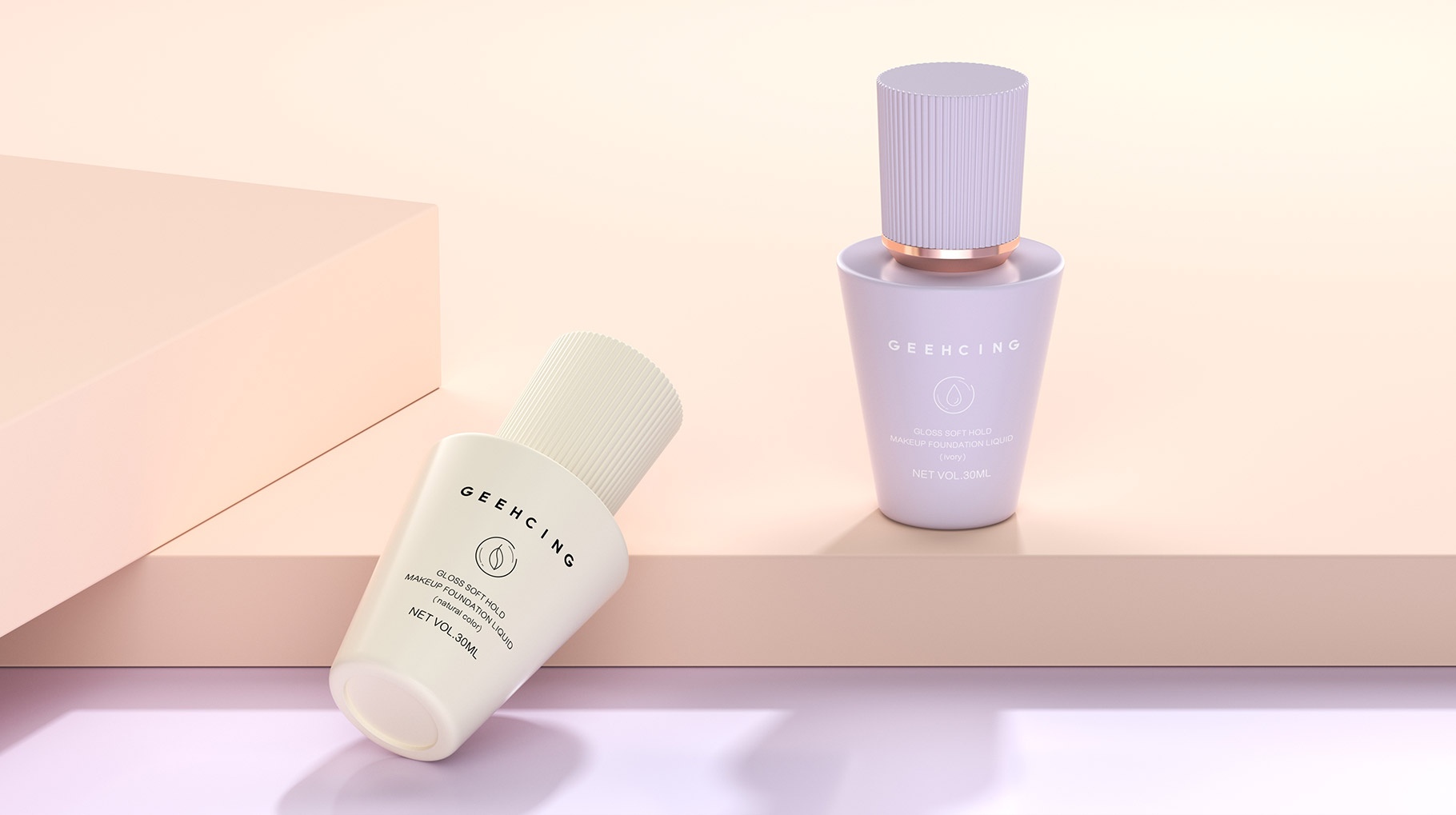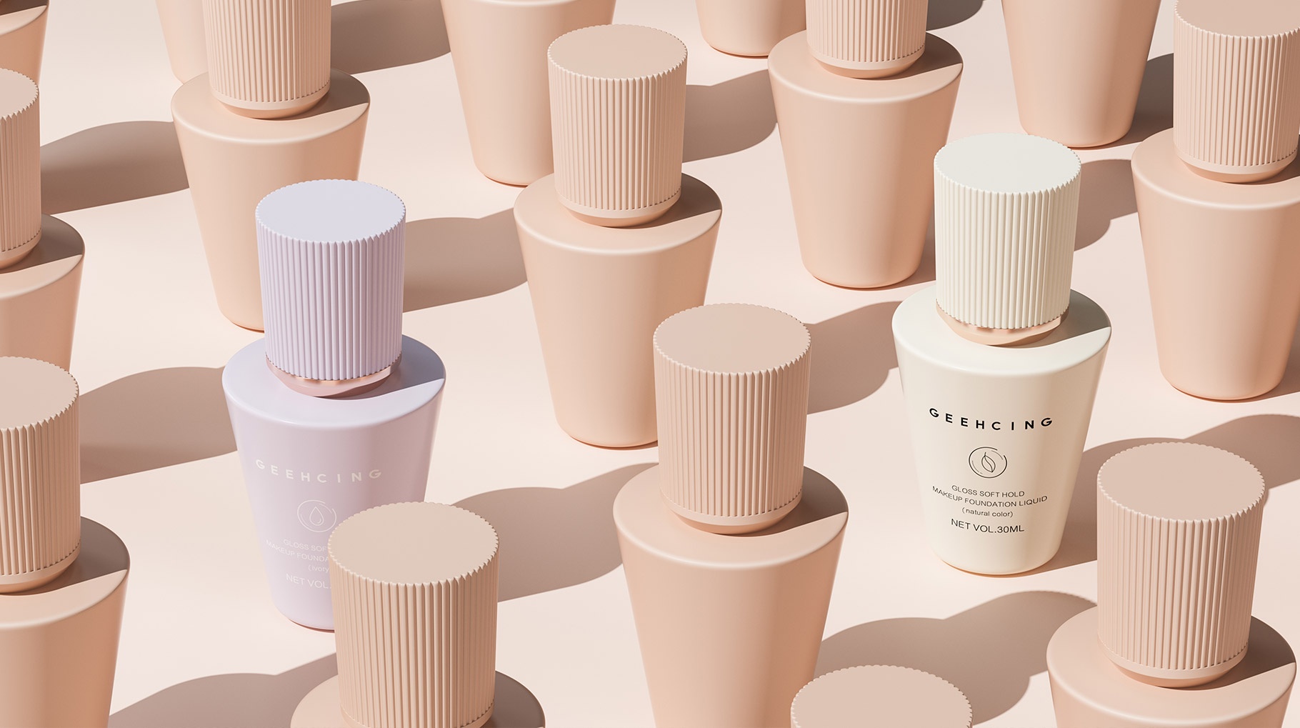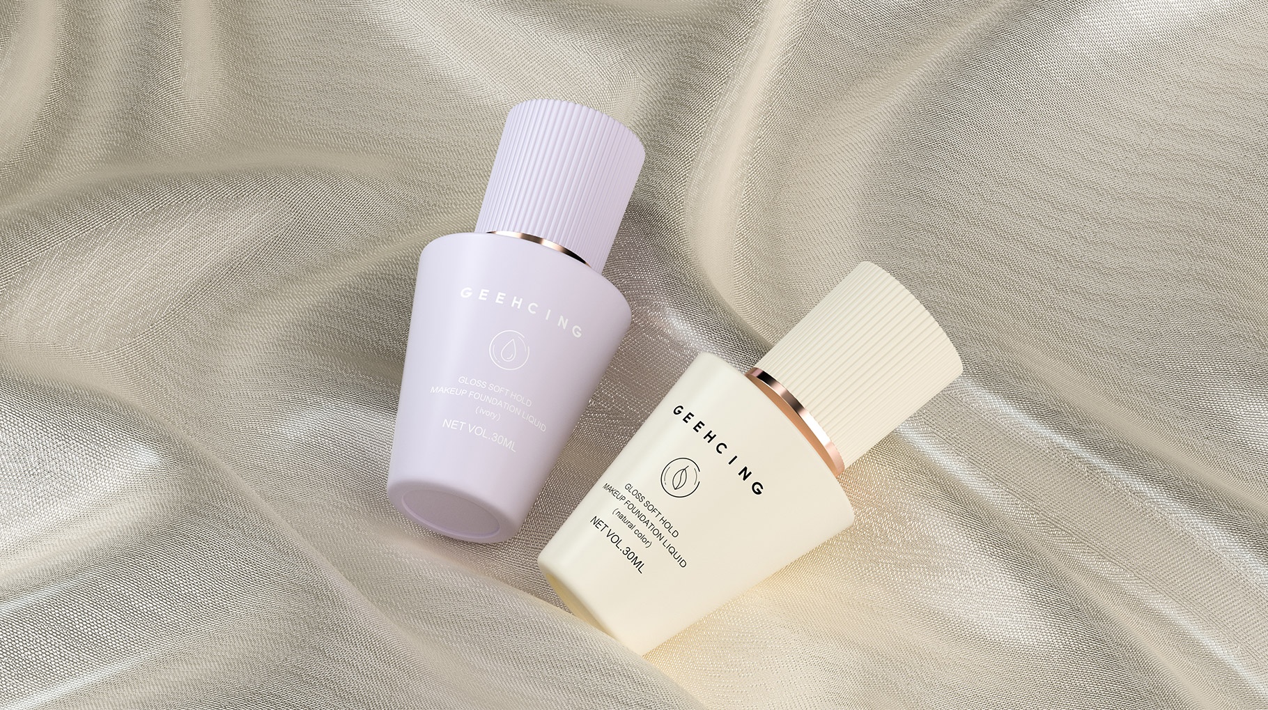 GEEHCING彩妝整體產品造型設計簡約、時尚、個性鮮明,整體瓶型顏色也貼近與肌膚的色彩,讓整體的視覺感官更加自然及舒適,傳遞品牌矢志打造更加高品質的產品理念。