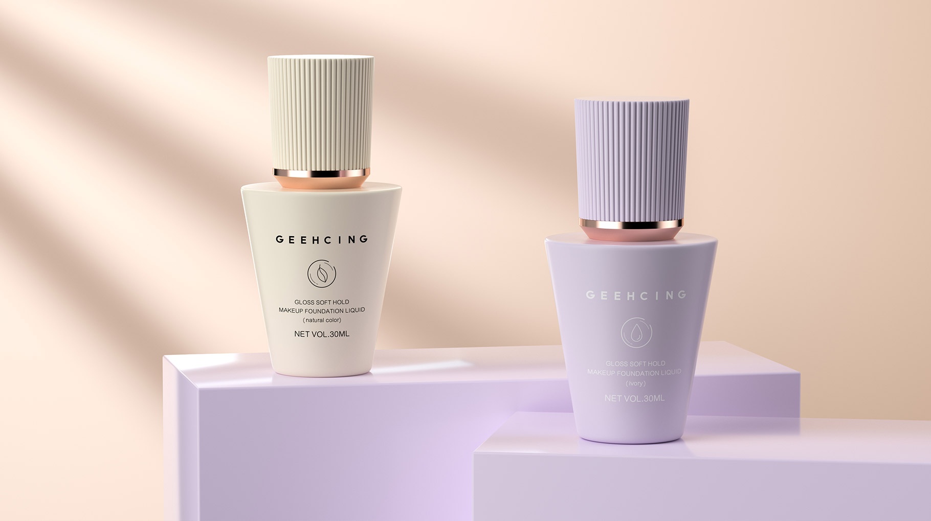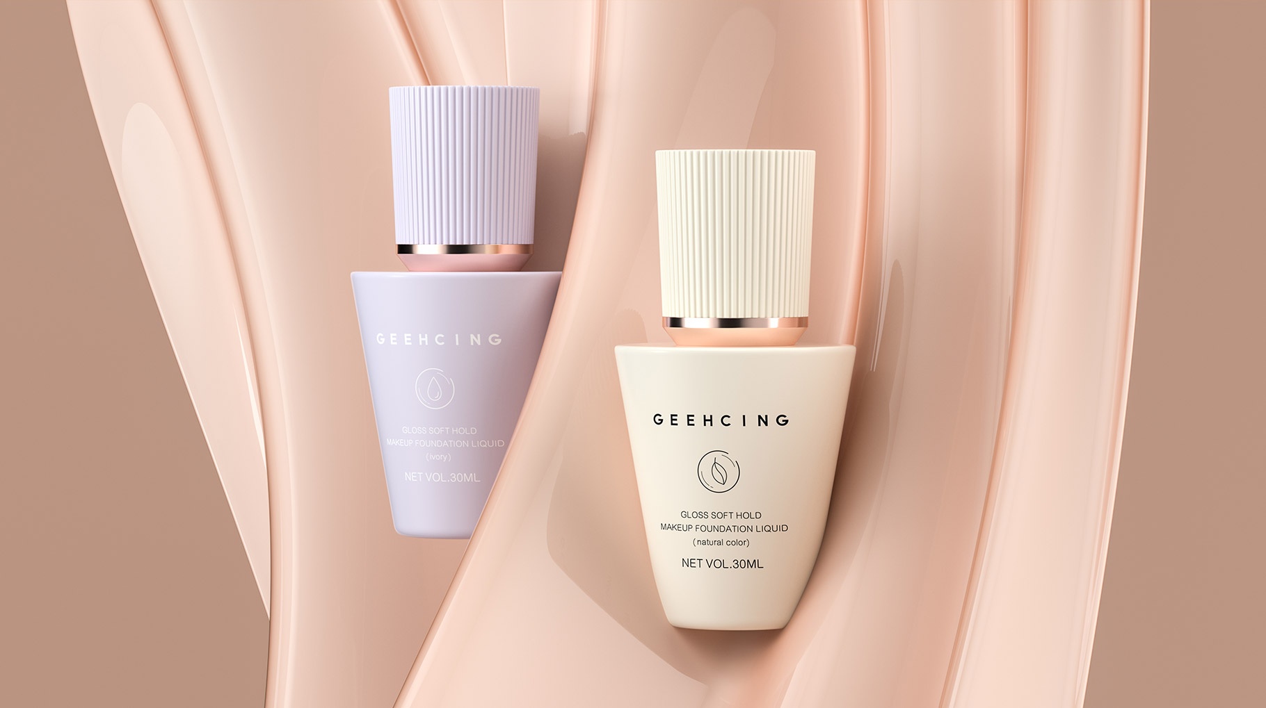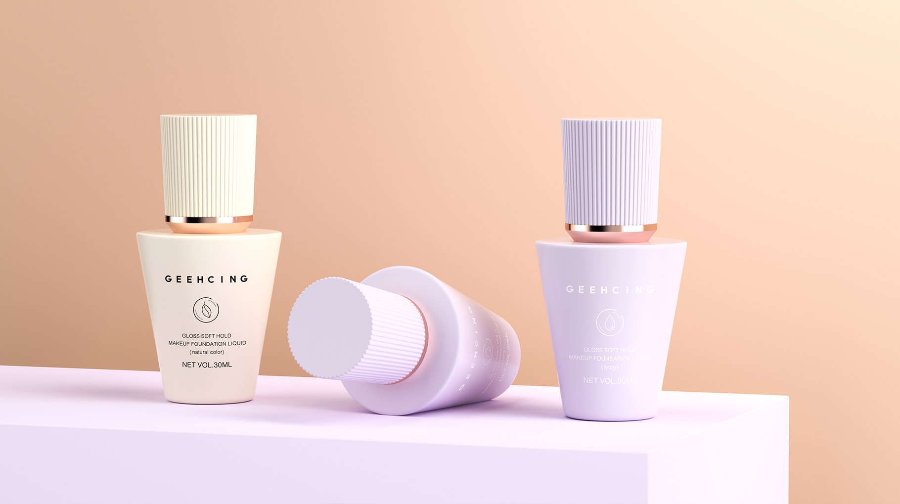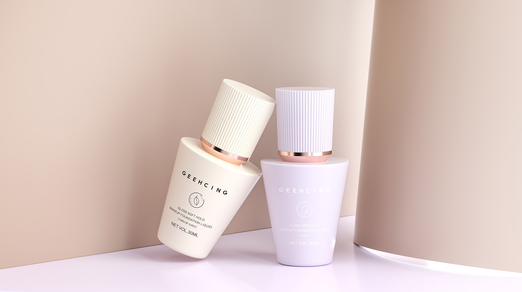 GEEHCING彩妝整體產品造型設計簡約、時尚、個性鮮明,整體瓶型顏色也貼近與肌膚的色彩,讓整體的視覺感官更加自然及舒適,傳遞品牌矢志打造更加高品質的產品理念。