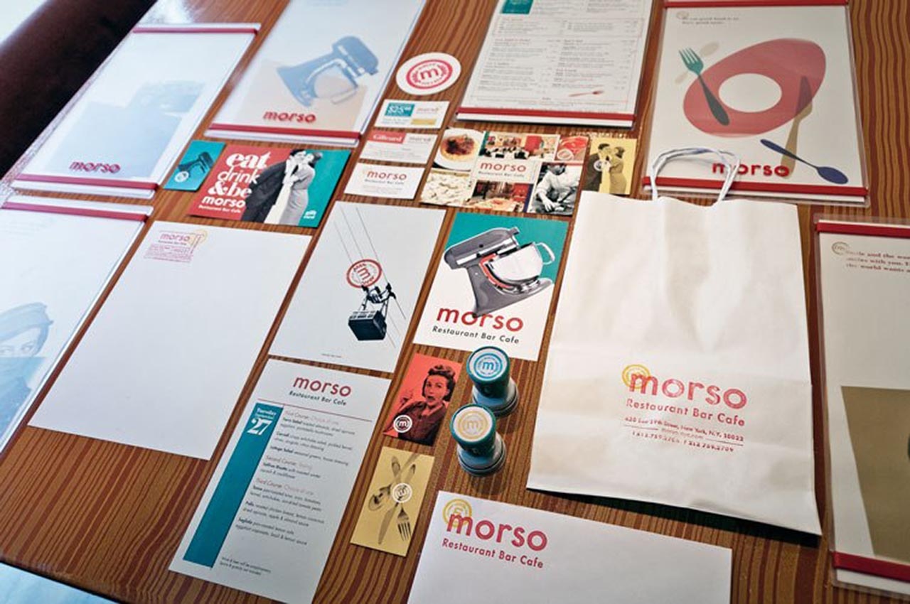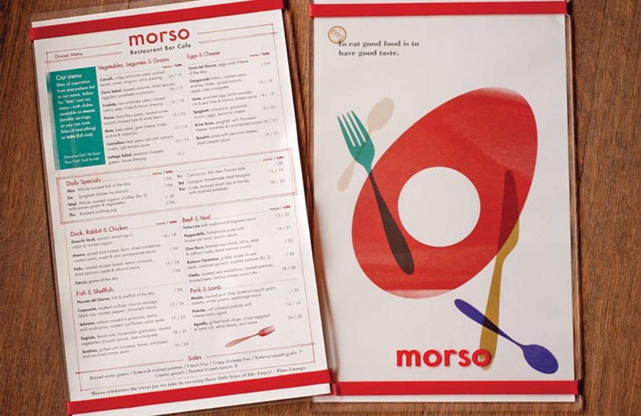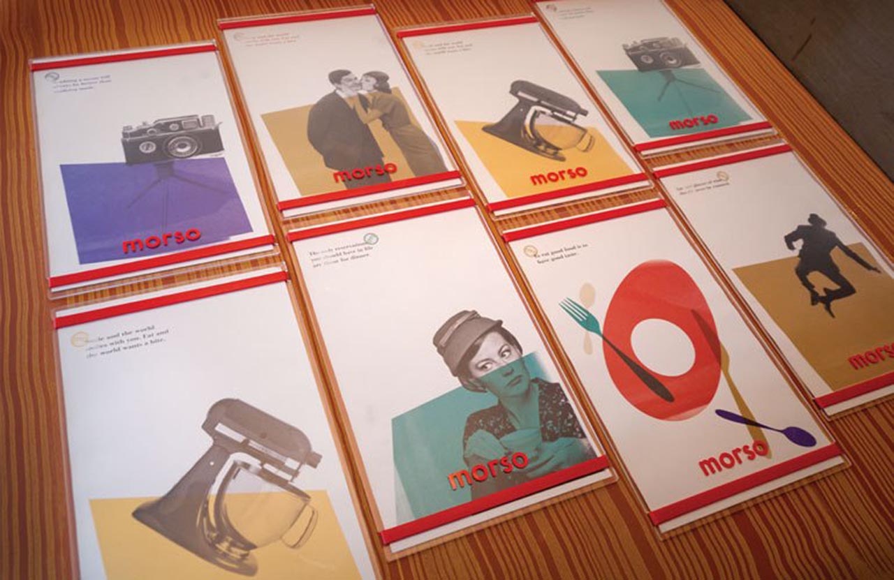 就像家庭式的菜肴一樣,我們想要設(shè)計(jì)一個(gè)讓人感到舒適和放松的空間。菜單簡(jiǎn)短而充滿活力,可以保持對(duì)話流暢。我們用大膽,明亮的海報(bào)填充墻壁,并飾有厚厚的厚臉皮,如“嘴里滿是沉默的金色”和“吃,喝,做Morso?!边@是一種食客所喜愛(ài)的氛圍,適合廚師Pino豐富多彩的氛圍。個(gè)性完美。