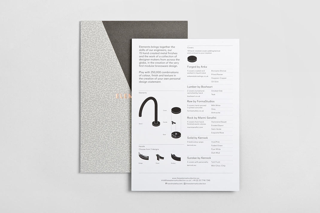 元素是最新的噴口和處理范圍從布魯克林的精品銅器業務,水印收集。它有15個金屬飾面,3個手柄設計和19個手工制作的封面。這些構成了可能的25萬種可能的組合。元素的模塊性、實質性和多樣性被描繪出來,并通過英國設計工作室DN&co創建的視覺標識來表達,然后在一系列獨特的小冊子封面上播放。